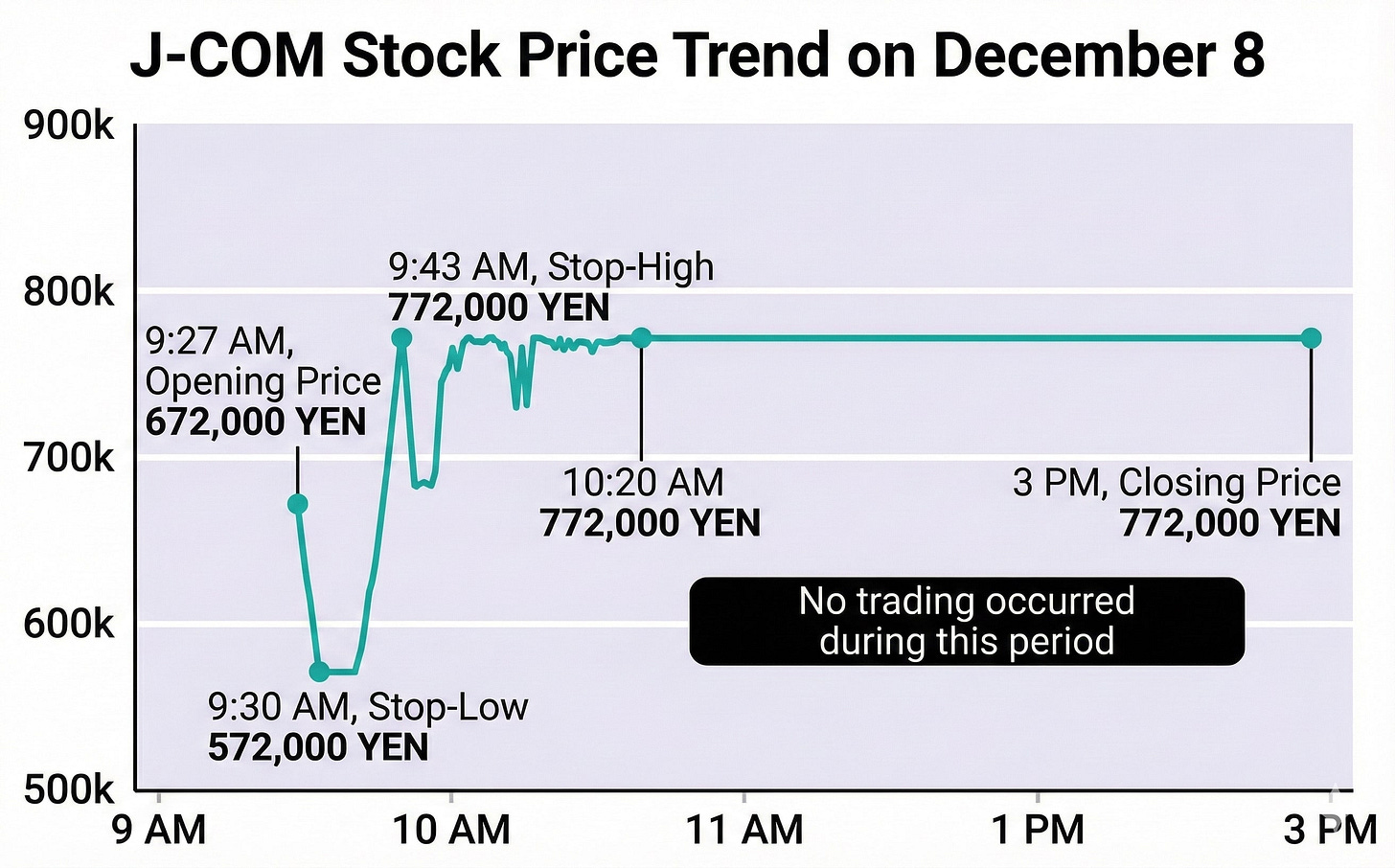 At 9:27 AM, a trader at Mizuho Securities received an order from a client to sell 1 share of J-Com for 610,000 yen.