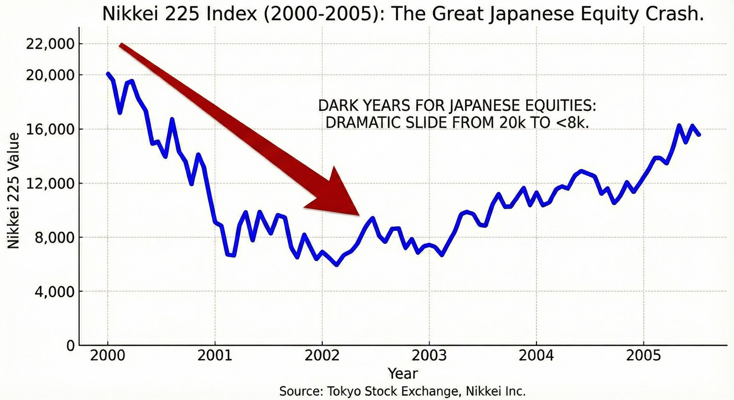 Kotegawa made his initial fortune between 2000 and 2004. These were dark years for Japanese equities. The Nikkei 225 slid from 20,000 to under 8,000.