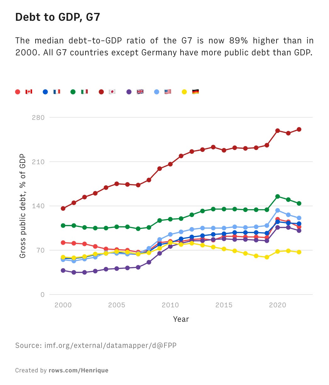 ![OC] Debt to GDP ratio of the G7 since 2000 : r/dataisbeautiful OC] Debt to GDP ratio of the G7 since 2000 : r/dataisbeautiful](https://substackcdn.com/image/fetch/$s_!yMDr!,w_1456,c_limit,f_auto,q_auto:good,fl_progressive:steep/https%3A%2F%2Fsubstack-post-media.s3.amazonaws.com%2Fpublic%2Fimages%2Fb425fb61-c647-4c92-8d05-11d515779615_1046x1224.png)