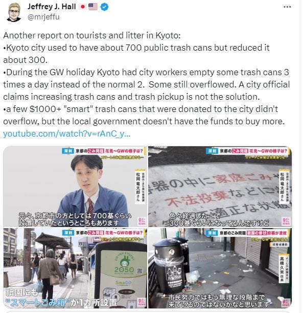 A recent tweet highlighted an ongoing issue that seems minor but is emblematic of the larger systemic problems the city faces: “Kyoto city used to have about 700 public trash cans but reduced it to about 300 because they overflowed (?)…. A few $1000+ 'smart' trash cans that were donated to the city didn't overflow, but the local government doesn't have the funds to buy more.”