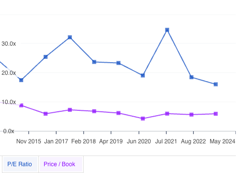 Price/Book Ratio: A P/B ratio of 5.0x is notably high for a company without substantial intellectual property or groundbreaking technology. This suggests that the market expects high future growth or values intangibles not captured in book value, possibly indicating overvaluation. However, it is comforting to see that the P/B ratio is going down over time