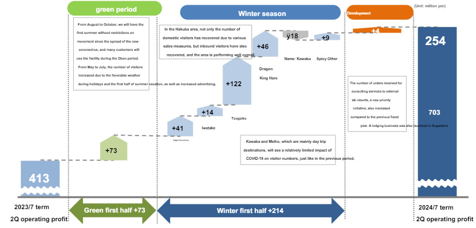 Revenue and Profit: The Ski Resort segment experienced substantial growth with revenue up by 19.5% and operating profit surging by 70.2%, thanks to high visitor numbers in both green and winter seasons driven by successful marketing strategies targeting non-skiers.