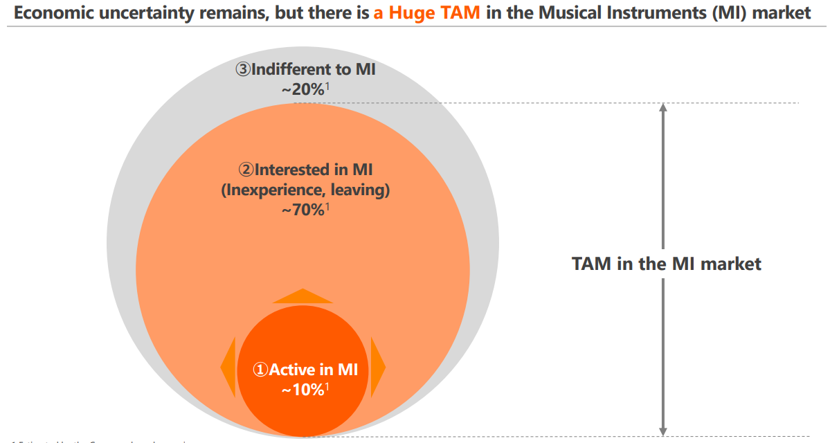 I see Roland taking a significant stride with their latest move to engage potential music instrument buyers. Considering Roland's estimation, the current market they occupy represents a mere 14% of the total addressable market (TAM). This means there's an expansive 86% of the TAM still available for exploration. Capturing even a fraction of this untapped market could significantly amplify Roland's already commendable year-on-year growth of 9.9%.