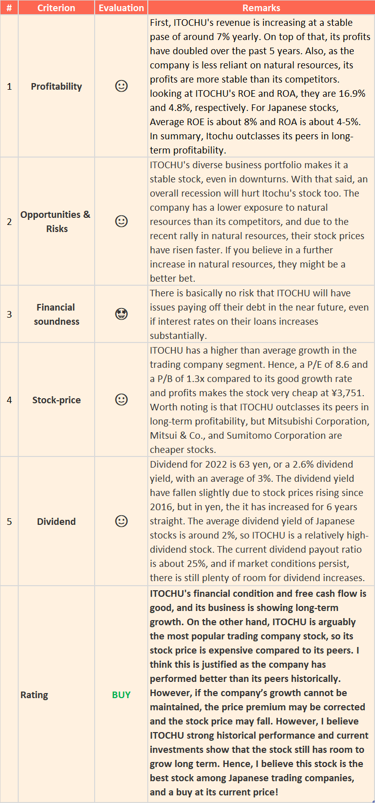 To find out if ITOCHU is a good investment, I have the following six criteria: