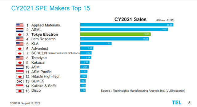 Based on calendar year 2021 sales, Tokyo Electron is a top 15 semiconductor production equipment manufacturer, in position 3 just behind ASML.