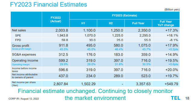 The company is guiding for strong growth for FY 2023, expecting net sales to increase +17.3%, and operating income +19.5%. These are impressive growth rates and the reason that make Tokyo Electron so attractive right now.