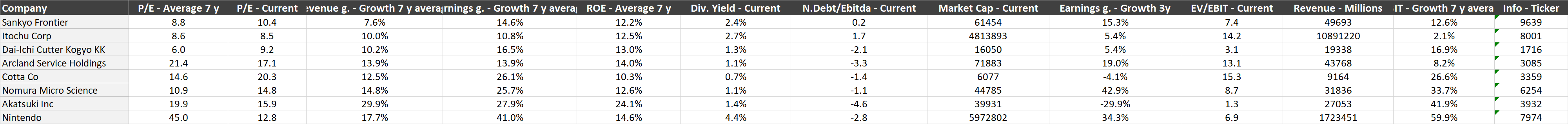 Even with these stringent filters in such a bull-market, I managed to find 175 Companies on the main Japanese stock exchanges. I guess it really shows how undervalued it is!