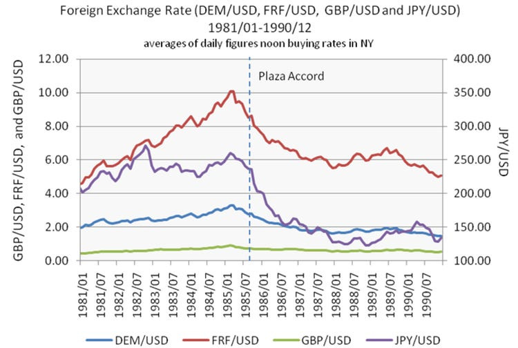 The "Plaza Accord" was a coordinated declaration by the G5 economies to lower the dollar. The largest decline was in the dollar-yen exchange rate which was the main target of the devaluation agreement.